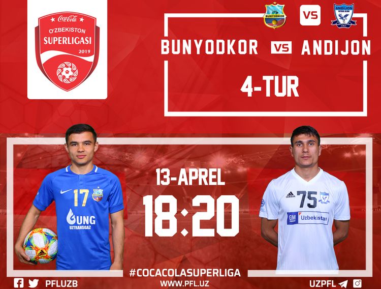 Ta`kidlash joiz, “Bunyodkor” — “Andijon” uchrashuvi 13 aprel, shanba kuni soat 18:20da bo`lib o`tadi.