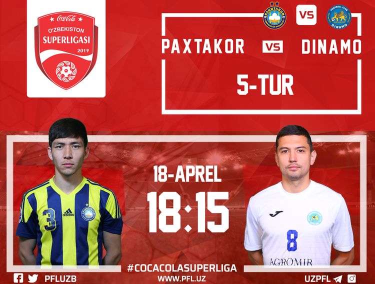 5-tur doirasida 18 aprel, payshanba kuni “Paxtakor” — “Dinamo” qarama-qarshiligi kuzatiladi. Mazkur bahsda “sherlar” o`zlarining an`anaviy sariq-ko`k libosida harakat qilishadi. Mehmonlar esa to`liq oq rangdagi sport formalarida maydonga chiqishadi.