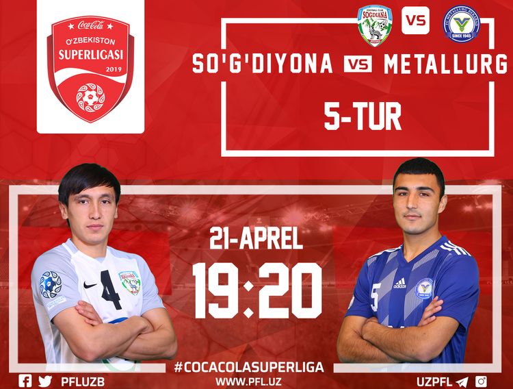 5-tur doirasida “So`g`diyona” o`z maydonida “Metallurg”ga qarshi bahs yuritadi. Uchrashuvda jizzaxliklar to`liq oq libosda maydonga chiqishadi. Bekobodlik futbolchilar esa to`liq ko`k liboslarda harakat qilishadi.