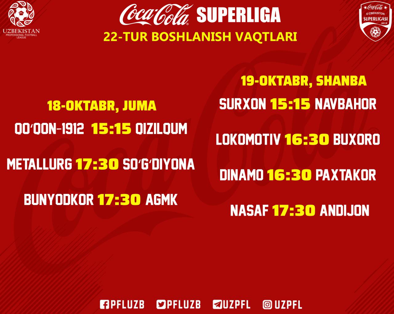 18-19 oktyabr kunlari Coca-Cola Superligasida 22-tur uchrashuvlari bo`lib o`tadi.