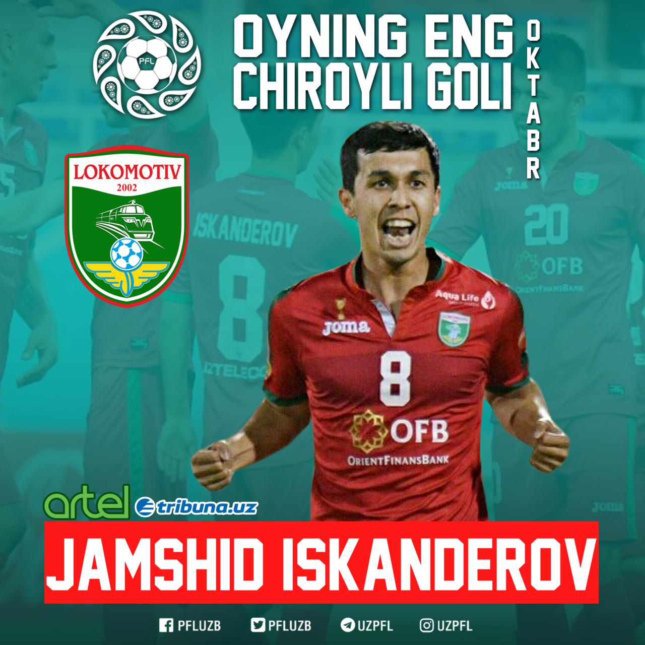 Oyning eng yaxshilarini aniqlash maqsadida o`tkazilgan so`rovnoma yakunlariga ko`ra, “Lokomotiv” jamoasi a`zosi Jamshid Iskanderovning AGMK darvozasiga kiritgan goli eng ko`p ochko jamg`arishga muvaffaq bo`ldi va oktyabr oyining eng chiroyli goli deya e`tirof etildi.