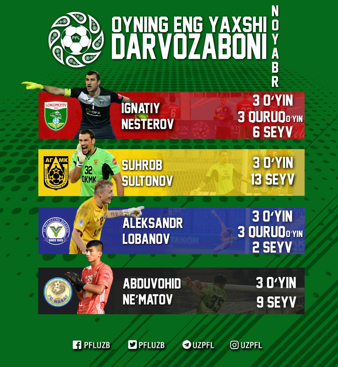 Quyida oyning eng yaxshi darvozaboni bo`lish uchun da`vogarlar ro`yxati taqdim etiladi: