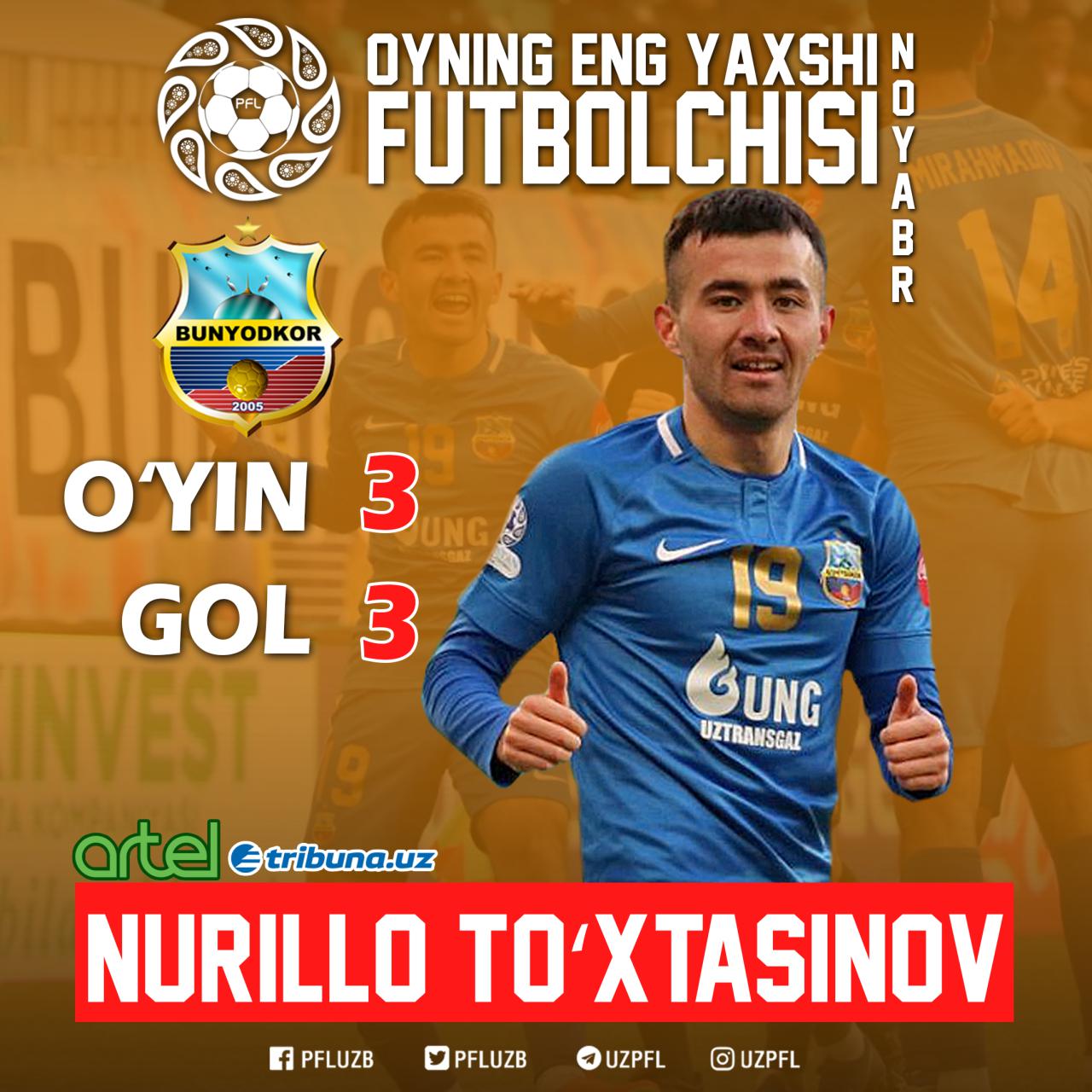 Oyning eng yaxshilarini aniqlash maqsadida o`tkazilgan so`rovnoma yakunlariga ko`ra, “Bunyodkor” jamoasi a`zosi Nurillo To`xtasinov (3 o`yin, 3 gol) eng ko`p ochko jamg`arishga muvaffaq bo`ldi va noyabr oyining eng yaxshi futbolchisi deya e`tirof etildi.