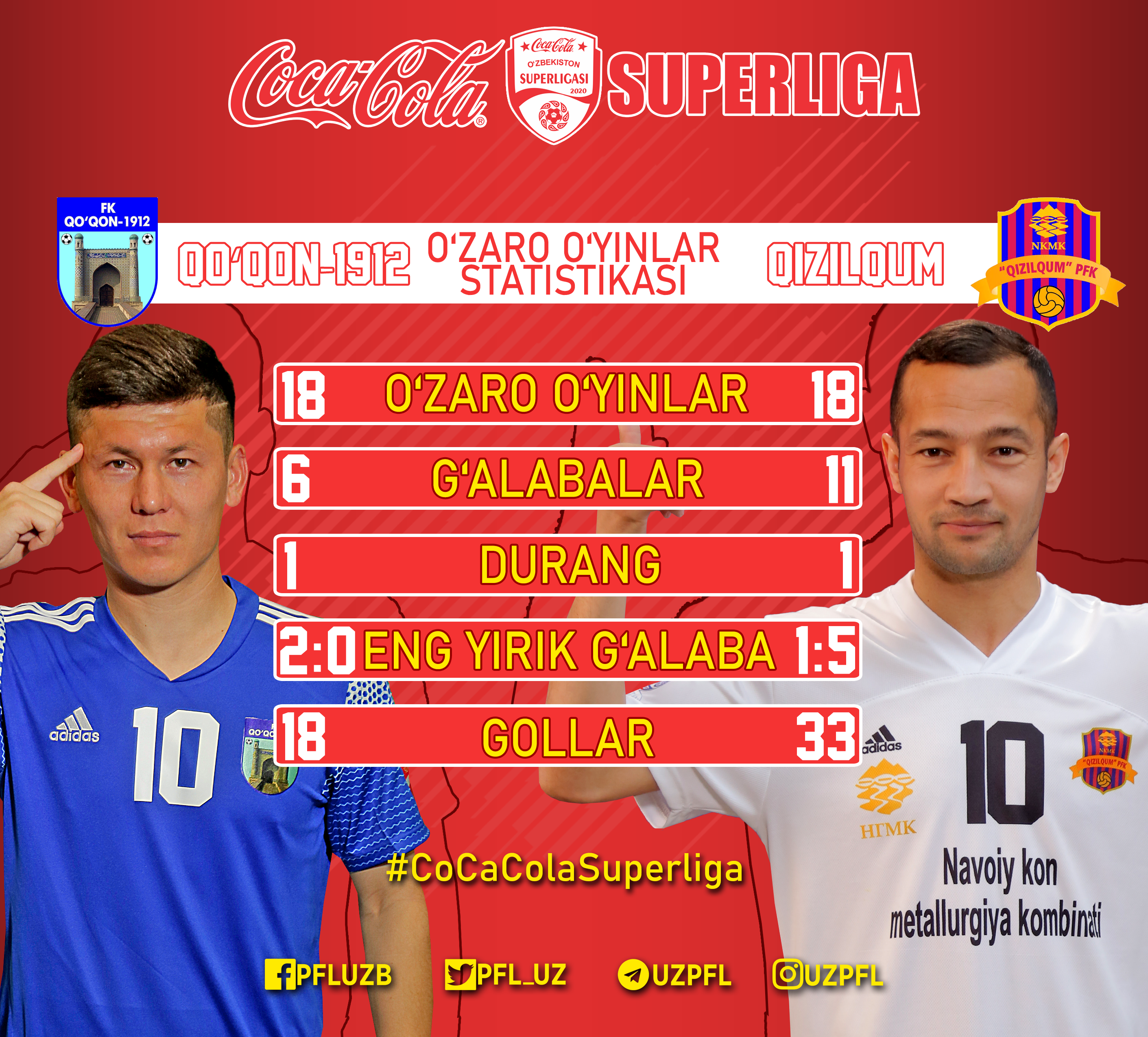 Bugun Coca Cola Superligada 5-tur o‘yinlari start oladi. Turning dastlabki uchrashuvida “Qo‘qon-1912” jamoasi “Qizilqum”ga qarshi bahs olib boradi. Ushbu jamoalar chempionat doirasida hozirga qadar 18 bor to‘qnash kelgan bo‘lib, ustunlik navoiyliklar tarafida.