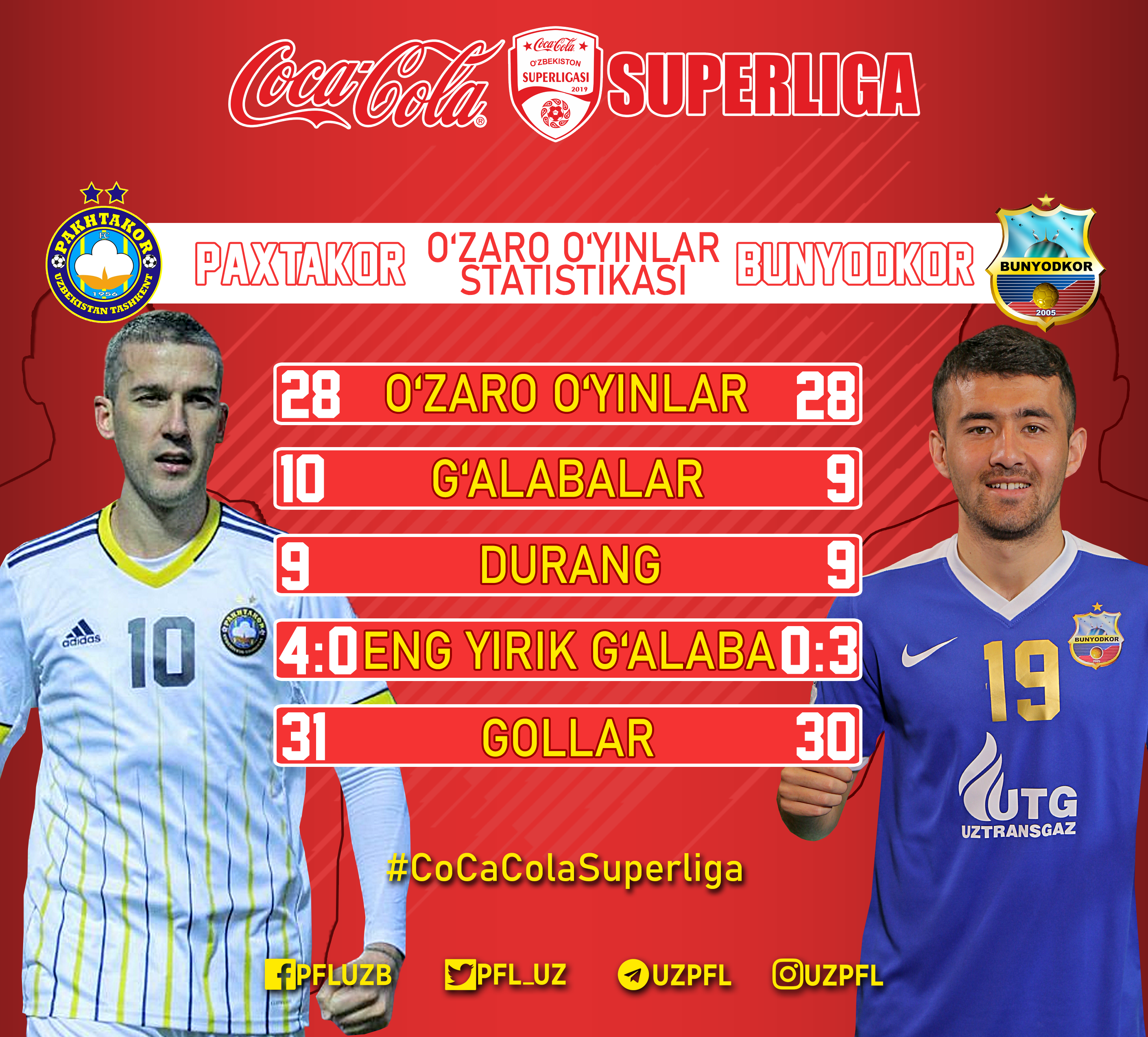 Coca Cola Superligada mavsumning eng qiziqarli uchrashuvlaridan biri bugun bo‘lib o‘tadi. Futbolni sog‘ingan muxlislar soat 20:00 dan e’tiboran “Paxtakor” va “Bunyodkor” jamoalari o‘rtasidagi poytaxt derbisi guvohiga aylanishadi.