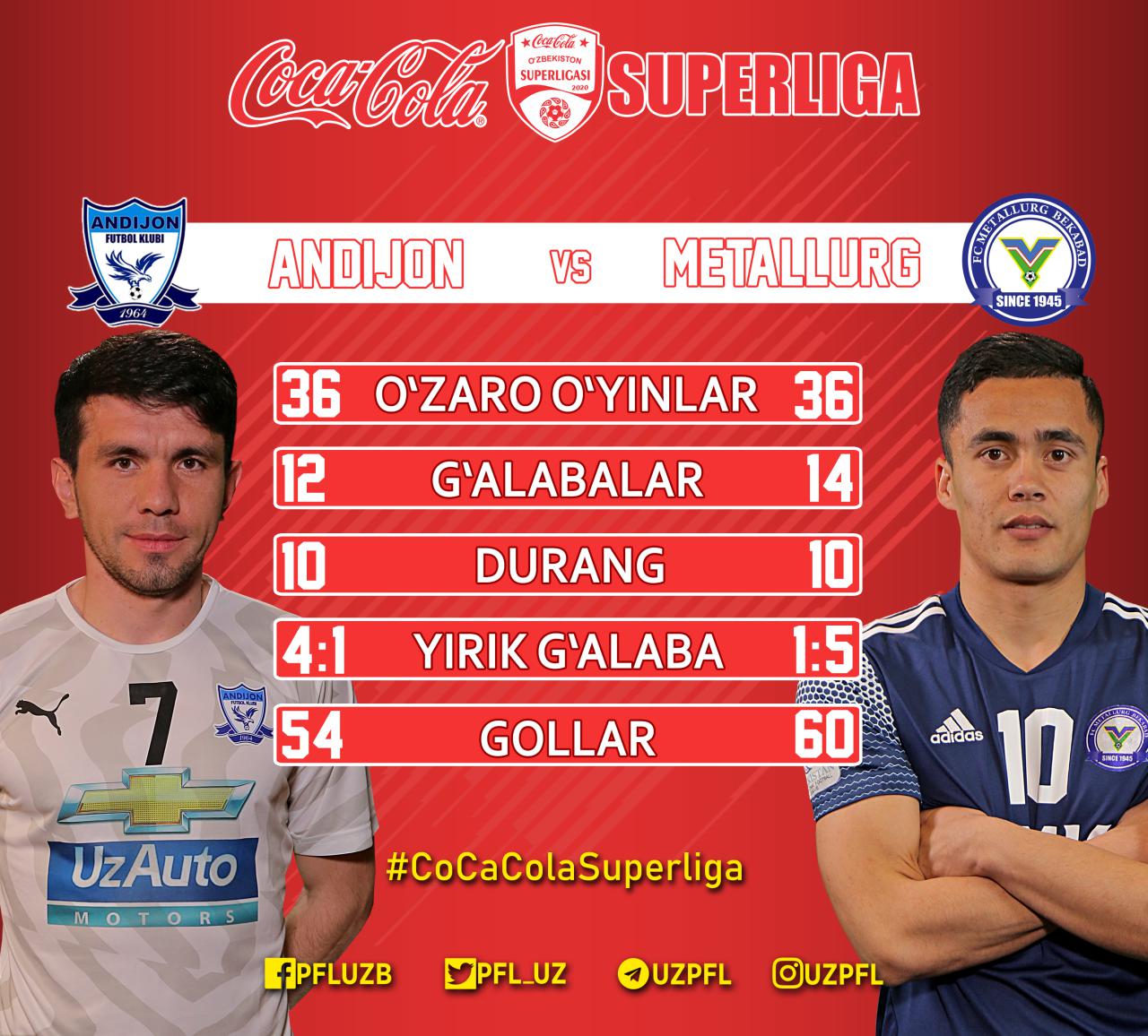 Bugun Coca Cola Superliga 5-turidan o‘rin olgan so‘nggi ikki o‘yin bo‘lib o‘tadi. Viktor Kumikov boshqaruvidagi “Andijon” jamoasi o‘z maydonida “Metallurg”ni qabul qiladi.