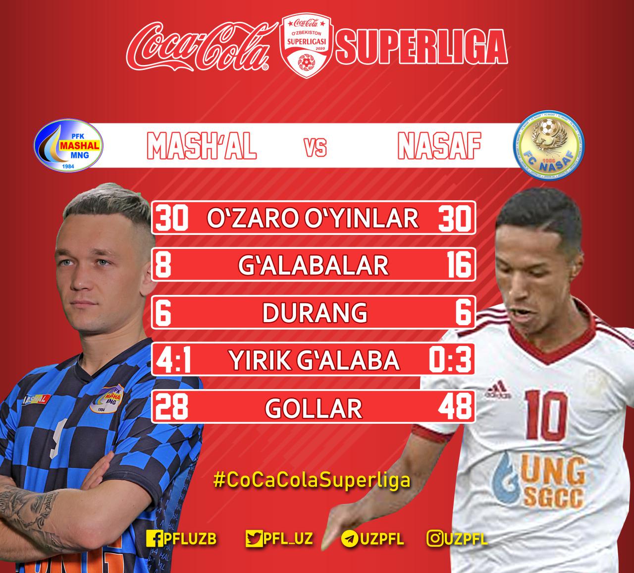 Bugun Coca ColaSuperliga 5-turidan o‘rin olgan so‘nggi ikki o‘yin bo‘lib o‘tadi. Muborakning “Mash’al” jamoasi “Bahrom Vafoev” stadionida “Nasaf” klubini qabul qiladi. Chempionat doirasida muxlislar shu vaqtga qadar ushbu jamoalar o‘rtasidagi 30 ta voha derbisi guvohi bo‘lishgan. 16 bahsda qarshiliklar g‘alaba qozongan bo‘lsalar, 8 ta bellashuvda “gazchilar”ning qo‘li baland kelgan. Yana 10 qarama-qarshilikda esa g‘olib nomi aniqlanmagan. To‘plar nisbati 48-28, “Nasaf” foydasiga.