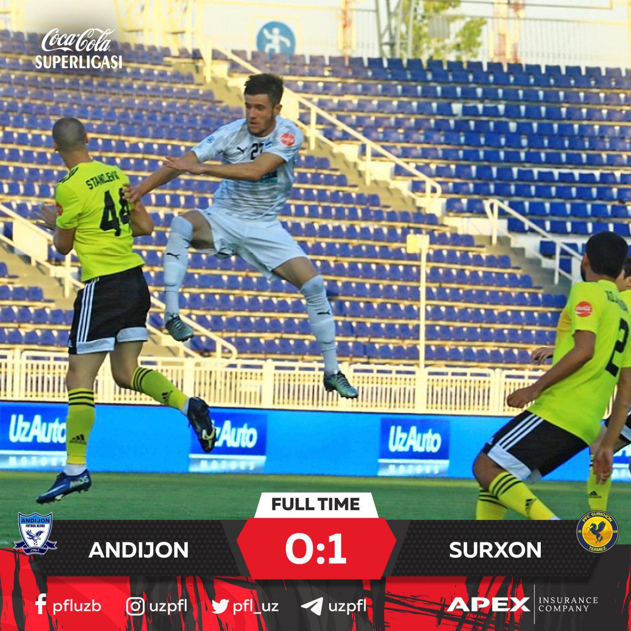 Hozirgina Coca Cola Superligasi 9-turidan o‘rin olgan “Andijon” hamda “Surxon” jamoalari o‘rtasidagi o‘yin o‘z nihoyasiga etdi.