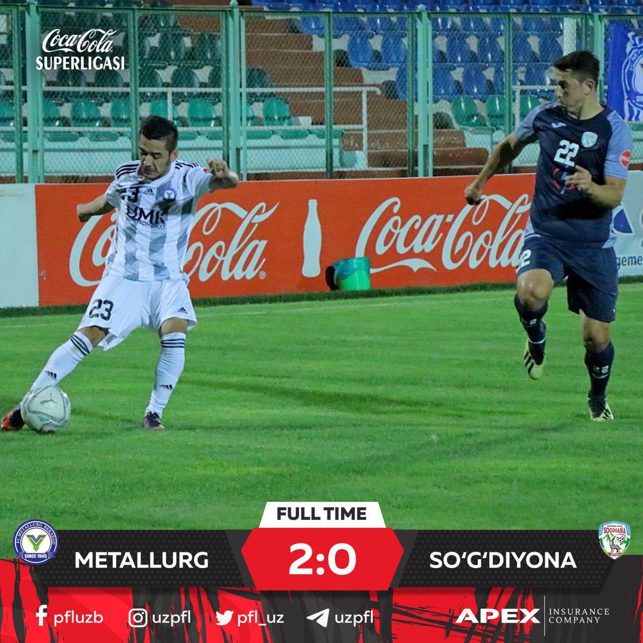 Hozirgina Coca Cola Superligasi 9-turidan o‘rin olgan “Metallurg” hamda “So‘g‘diyona” jamoalari o‘rtasidagi o‘yin o‘z nihoyasiga etdi.
