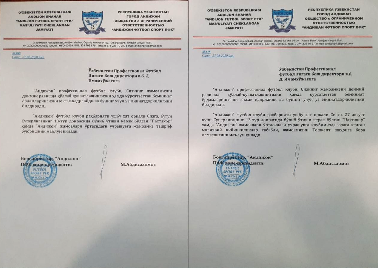 “Andijon” klubining birinchi xatidan 1 soat-u 20 daqiqa o‘tib, klub uchrashuvda ishtirok etmoqchi ekani borasida xat yo‘lladi. Har ikki xat vitse-prezident Ma’ruf Abdusalomov tomonidan imzolangan.