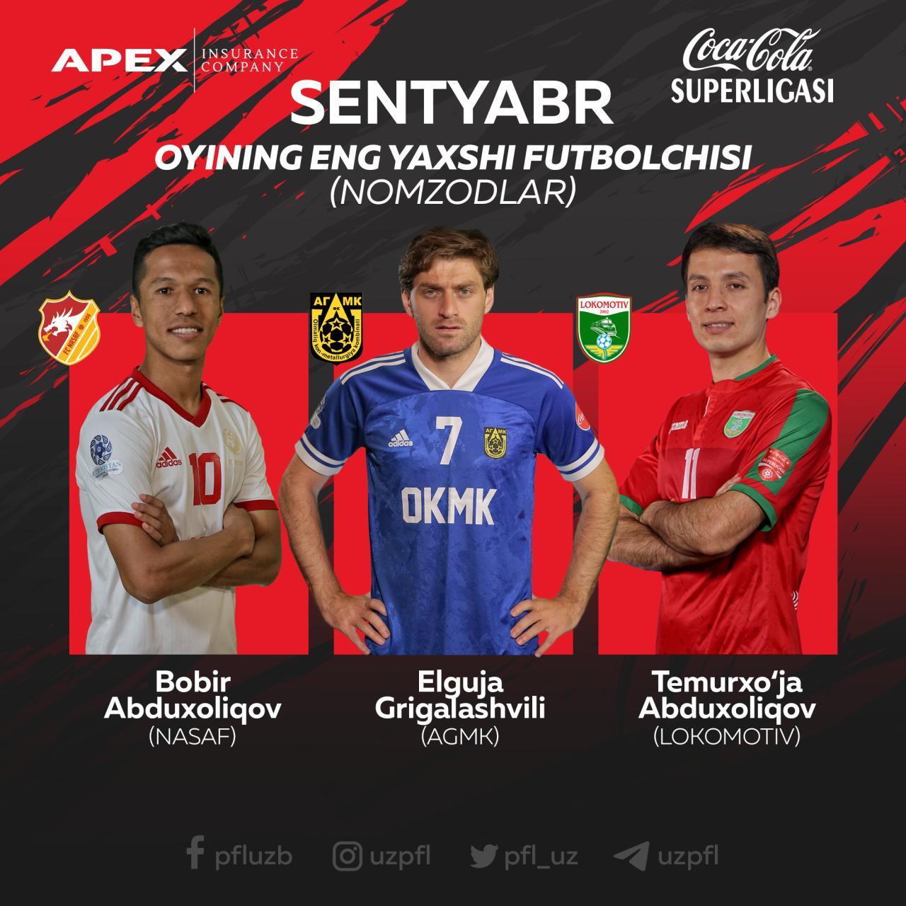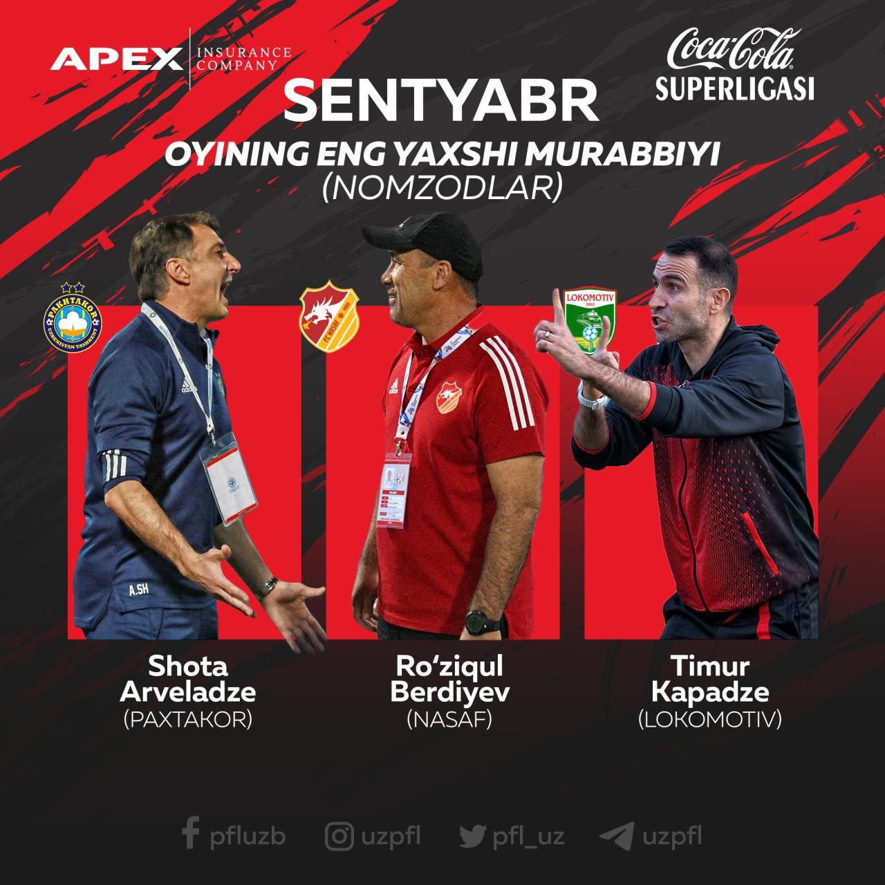 O‘zbekiston Professional futbol ligasi odatga ko‘ra, har oy Coca Cola Superliganing eng yaxshi murabbiy va futbolchisi, shuningdek, eng chiroyli golni aniqlab kelmoqda. Sentyabr oyida Superligada 14, 15, 16 hamda 17-tur uchrashuvlari bo‘lib o‘tdi. Mazkur bellashuvlar davomida ko‘plab futbolchi va murabbiylar o‘zlarini ko‘rsatishga erishdi.