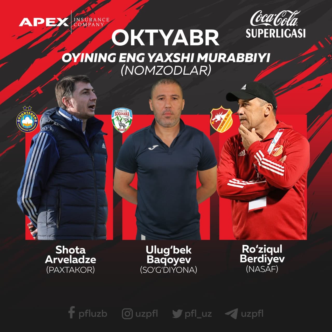 O‘zbekiston Professional futbol ligasi odatga ko‘ra, har oy Coca Cola Superliganing eng yaxshi murabbiy va futbolchisi, shuningdek, eng chiroyli golni aniqlab kelmoqda. Oktyabr oyida Superligada 18, 19, 20, 21 hamda 22-tur uchrashuvlari bo‘lib o‘tdi. Mazkur bellashuvlar davomida ko‘plab futbolchi va murabbiylar o‘zlarini ko‘rsatishga erishdi.
