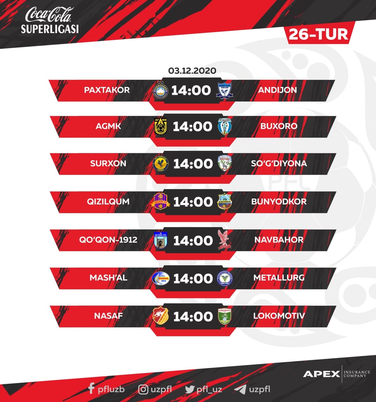 3-dekabr kuni Coca Cola Superligada so‘nggi, 26-tur o‘yinlari bo‘lib o‘tadi. Tur doirasidan o‘rin olgan barcha bellashuvlar 14:00 da start oladi.