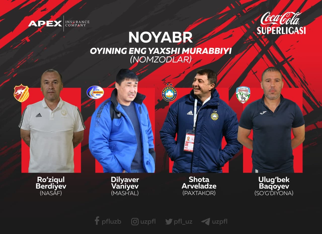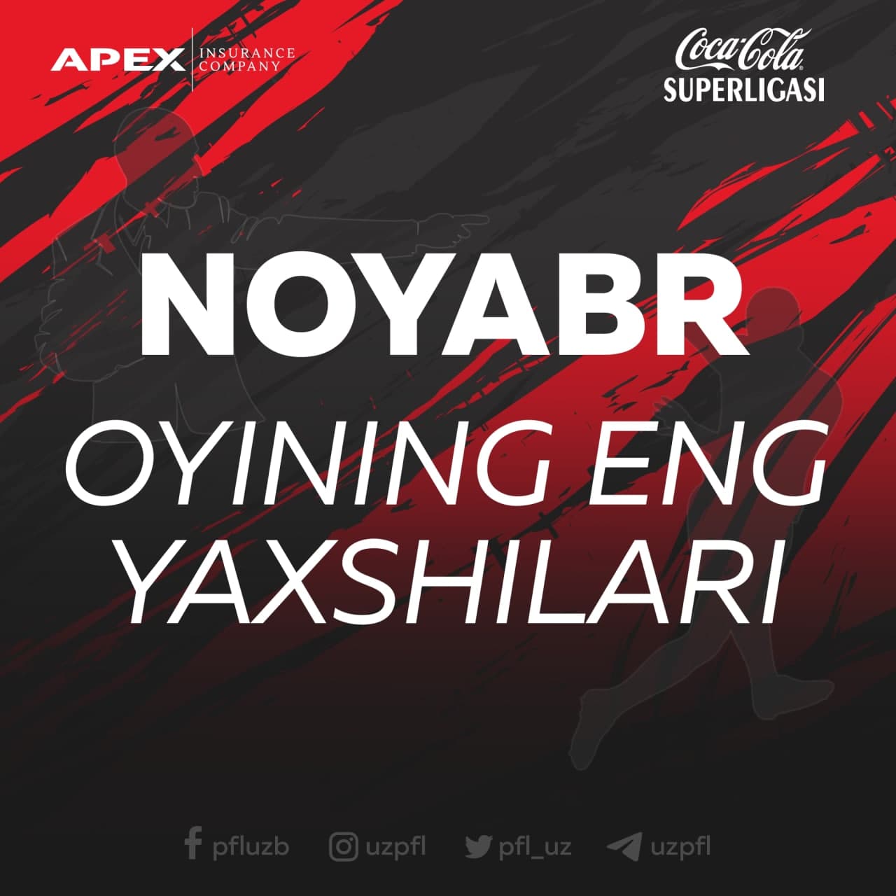 O‘zbekiston Professional futbol ligasi odatga ko‘ra, har oy Coca Cola Superliganing eng yaxshi murabbiyi va futbolchisi, shuningdek, eng chiroyli golini aniqlab kelmoqda. Noyabr oyida Superligada 23, 24, 25 hamda 26-tur uchrashuvlari bo‘lib o‘tdi. Mazkur bellashuvlar davomida ko‘plab futbolchi va murabbiylar o‘zlarini ko‘rsatishga erishdi.