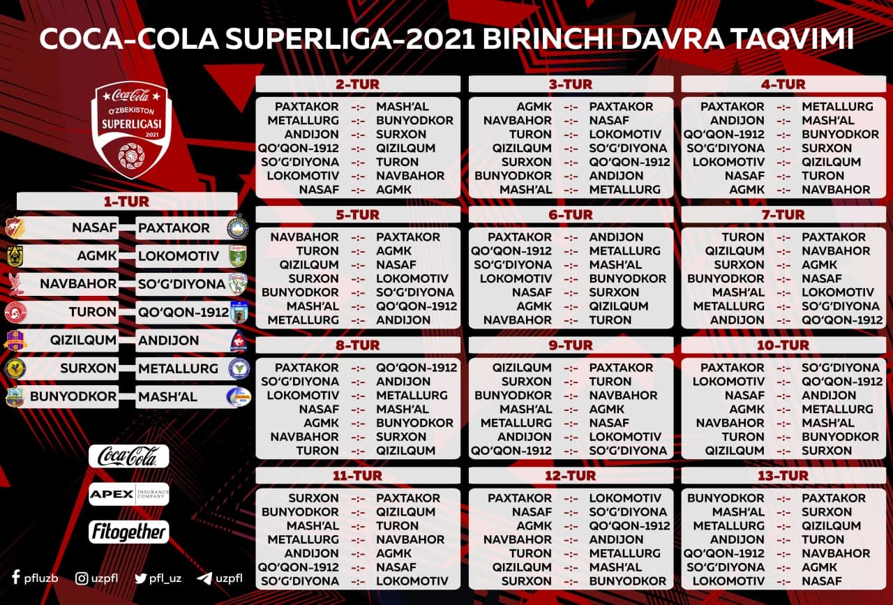 Bugun 20-fevral, shanba kuni Coca Cola Superligasining yangi mavsumi uchun qur’a tashlandi. Quyida birinchi davra taqvimi bilan tanishish imkoniga egasiz.