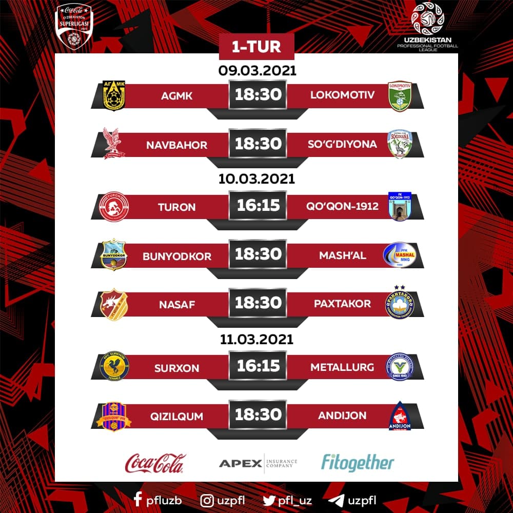 9-11-mart kunlari Coca Cola Superligasida 1-tur o‘yinlari bo‘lib o‘tadi. Quyida ushbu bellashuvlarning boshlanish vaqtlari bilan tanishasiz.