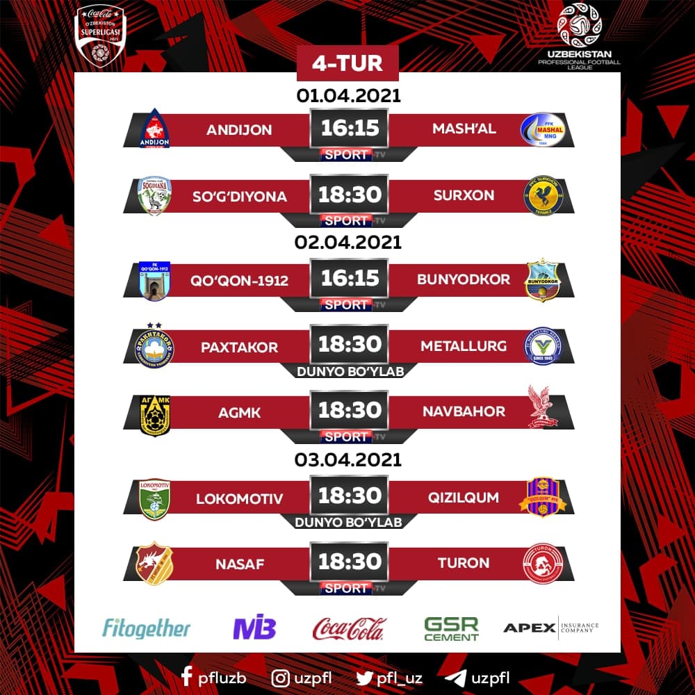 1–3-aprel kunlari Coca Cola Superligasida 4-tur o‘yinlari bo‘lib o‘tadi. Quyida ushbu bellashuvlarning boshlanish vaqtlari va ularni translyatsiya qiluvchi telekanallar bilan tanishasiz.