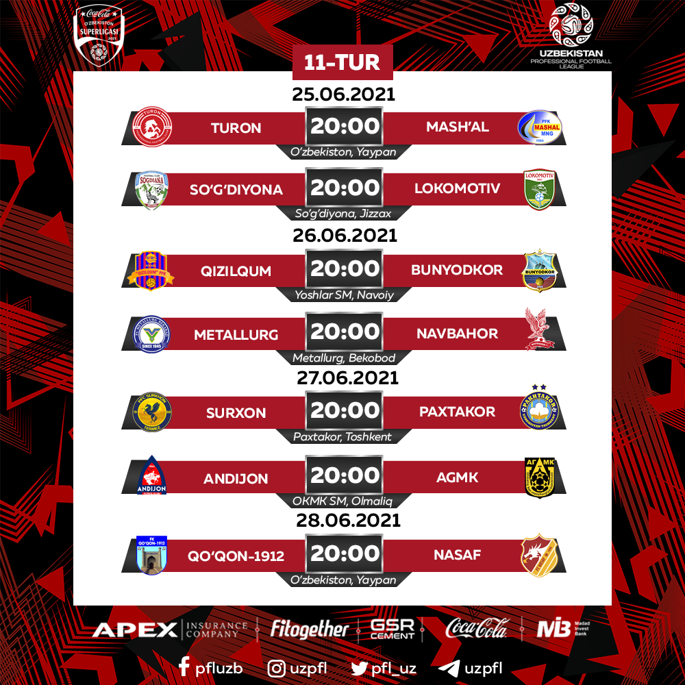 25 – 28-iyun kunlari Coca-Cola Superligasida 11-tur o‘yinlari bo‘lib o‘tadi. Avval xabar berilganidek, “Surxon” mazkur turni nominal mezbon sifatida “Paxtakor” stadionida, “Andijon” esa AGMKga qarshi bahsni Olmaliqda o‘tkazadi.