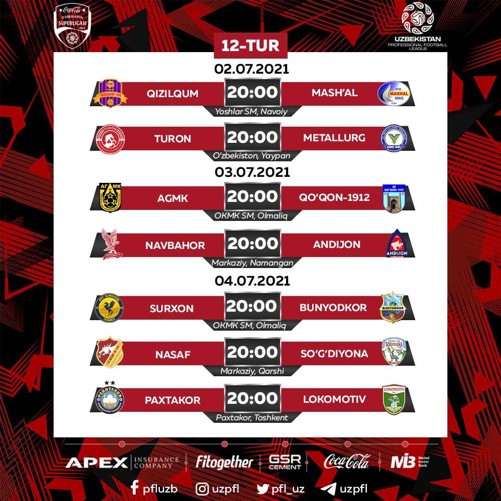 Ma’lumot uchun, O‘zPFL iyun oyidan e’tiboran uchrashuvlarni faqatgina 20:00 ga tayin qilgani holda, futbolchilarning quyosh issig‘ida o‘ynashlariga yo‘l qo‘ymayapti.