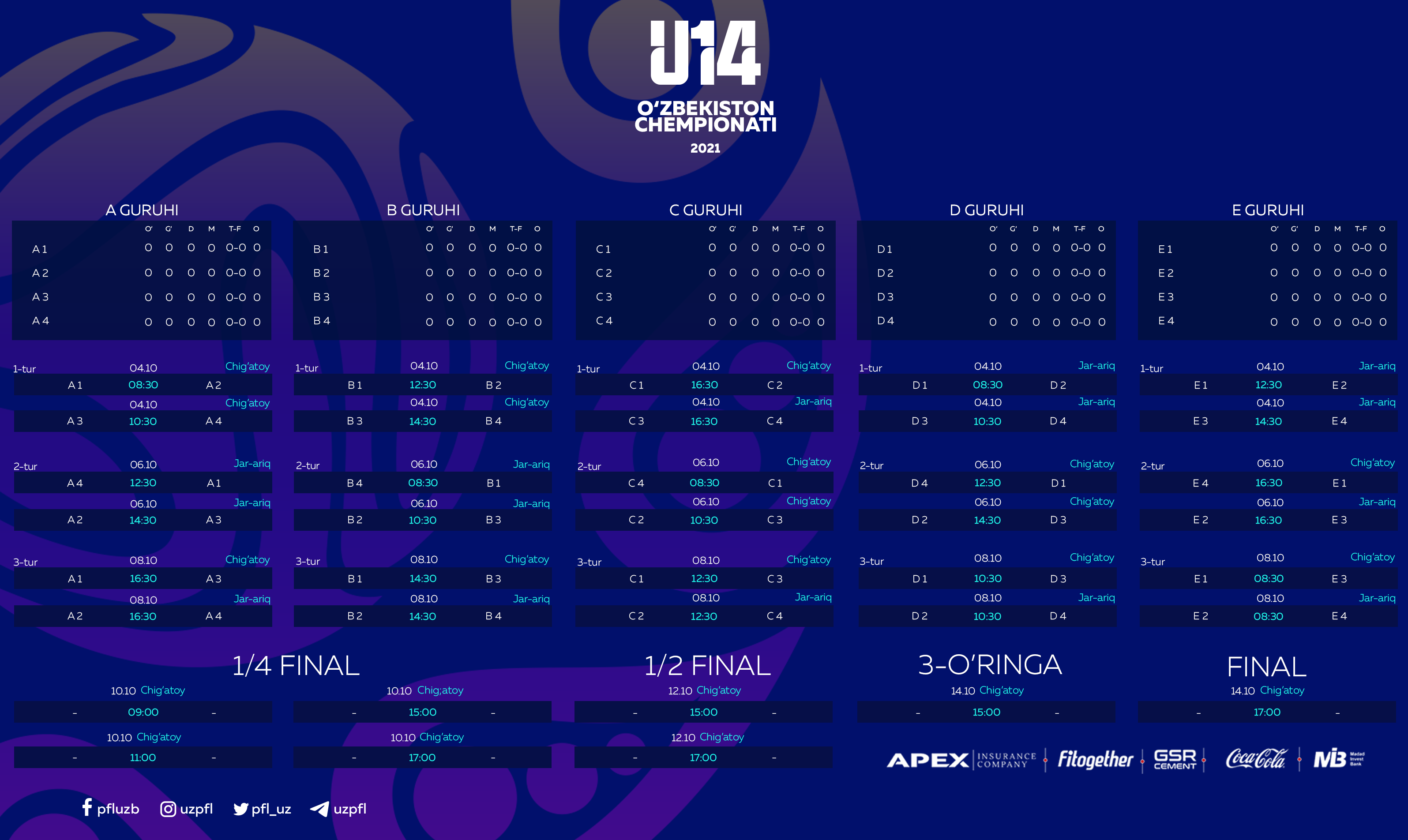 Musobaqaga qur’a 30-sentyabr kuni soat 12:00 da tashlab beriladi va jarayon YouTube kanalimiz orqali jonli efirga olib chiqiladi. Shuningdek, futbol uchrashuvlari ham YouTube orqali onlayn translyatsiya qilinishi rejalashtirilgan.