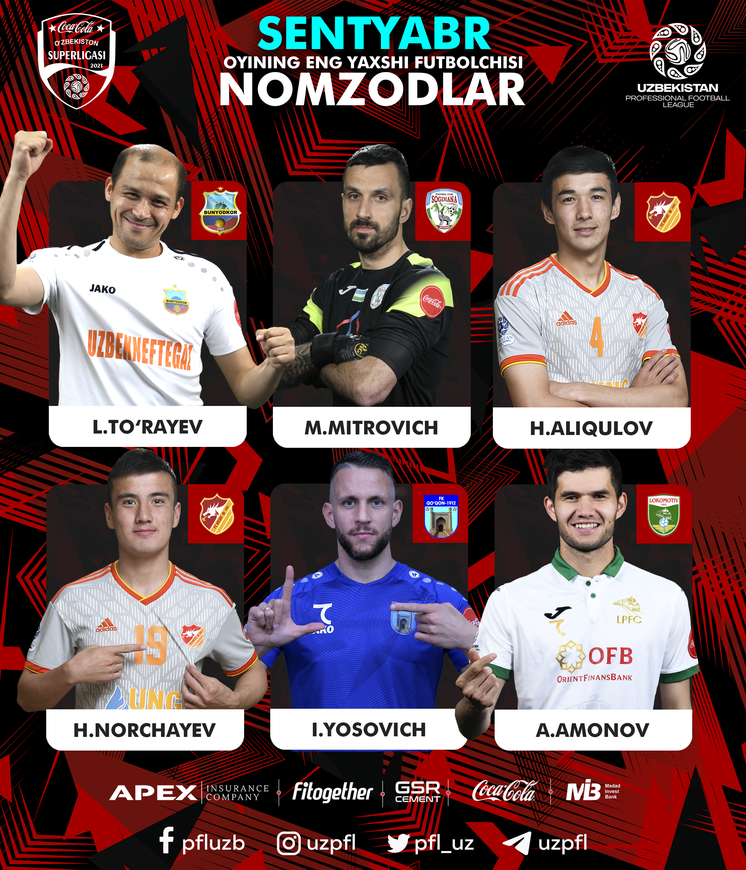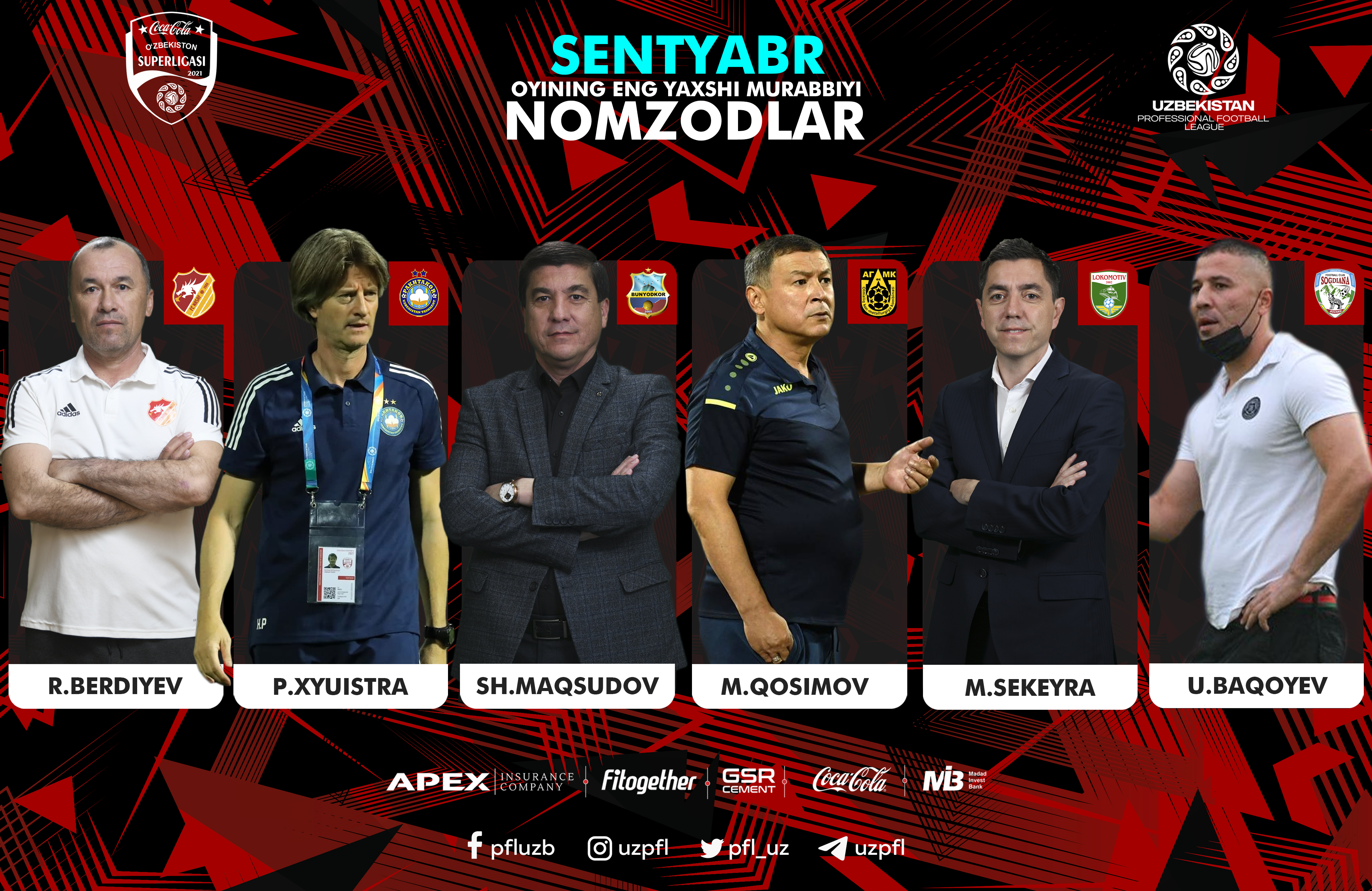 O‘zbekiston Professional futbol ligasi odatga ko‘ra, har oy Coca-Cola Superliganing eng yaxshi murabbiyi va futbolchisi, shuningdek, eng chiroyli golini aniqlab kelmoqda. Ortda qolgan sentyabr oyida Superligada 4 ta tur bahslari bo‘lib o‘tdi. Mazkur bellashuvlar davomida ko‘plab futbolchi va murabbiylar o‘zlarini ko‘rsatishga erishdi.