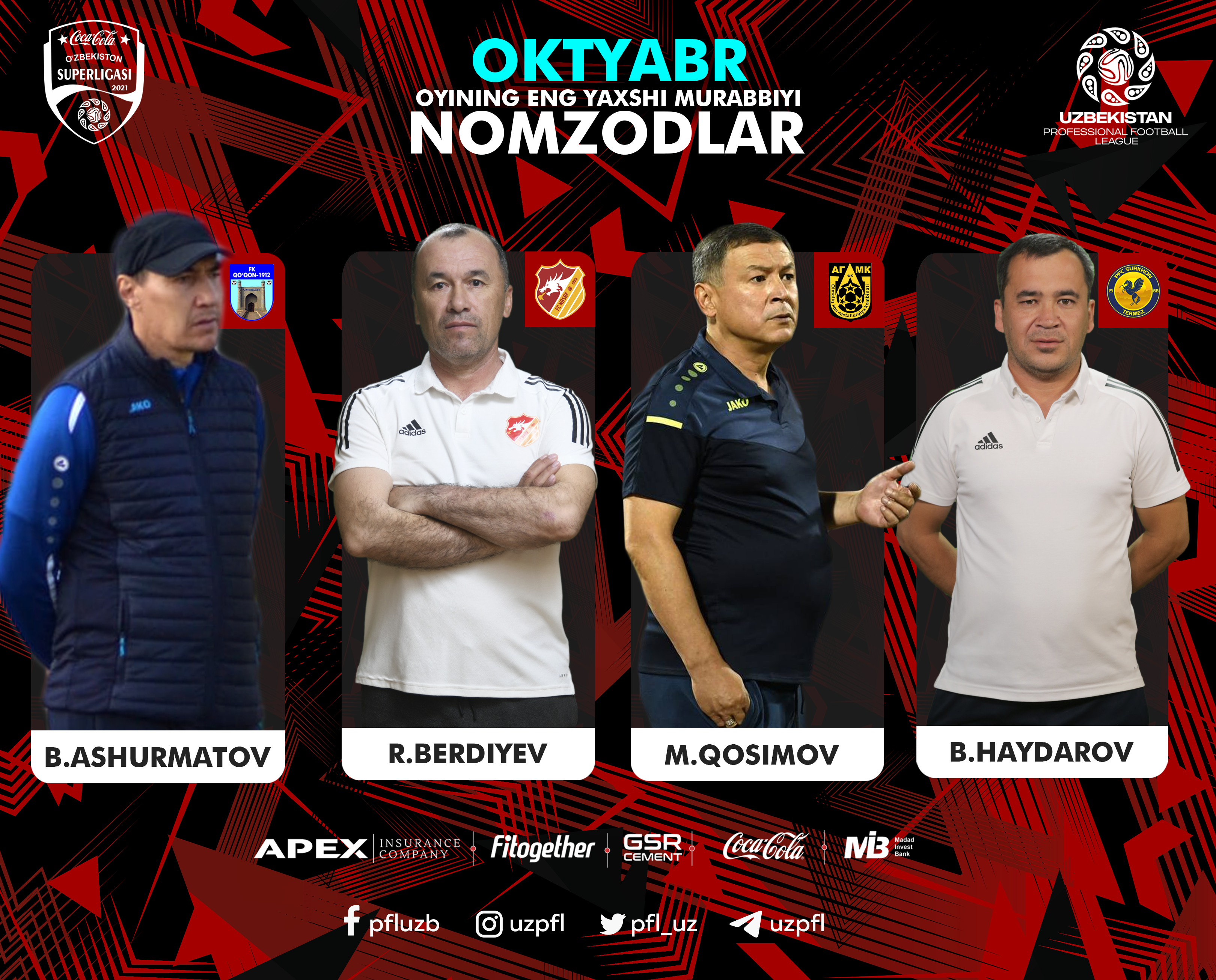 O‘zbekiston Professional futbol ligasi odatga ko‘ra, har oy Coca-Cola Superliganing eng yaxshi murabbiyi va futbolchisi, shuningdek, eng chiroyli golini aniqlab kelmoqda. Ortda qolgan oktyabr oyida Superligada 3 ta tur bahslari bo‘lib o‘tdi. Mazkur bellashuvlar davomida ko‘plab futbolchi va murabbiylar o‘zlarini ko‘rsatishga erishdi.