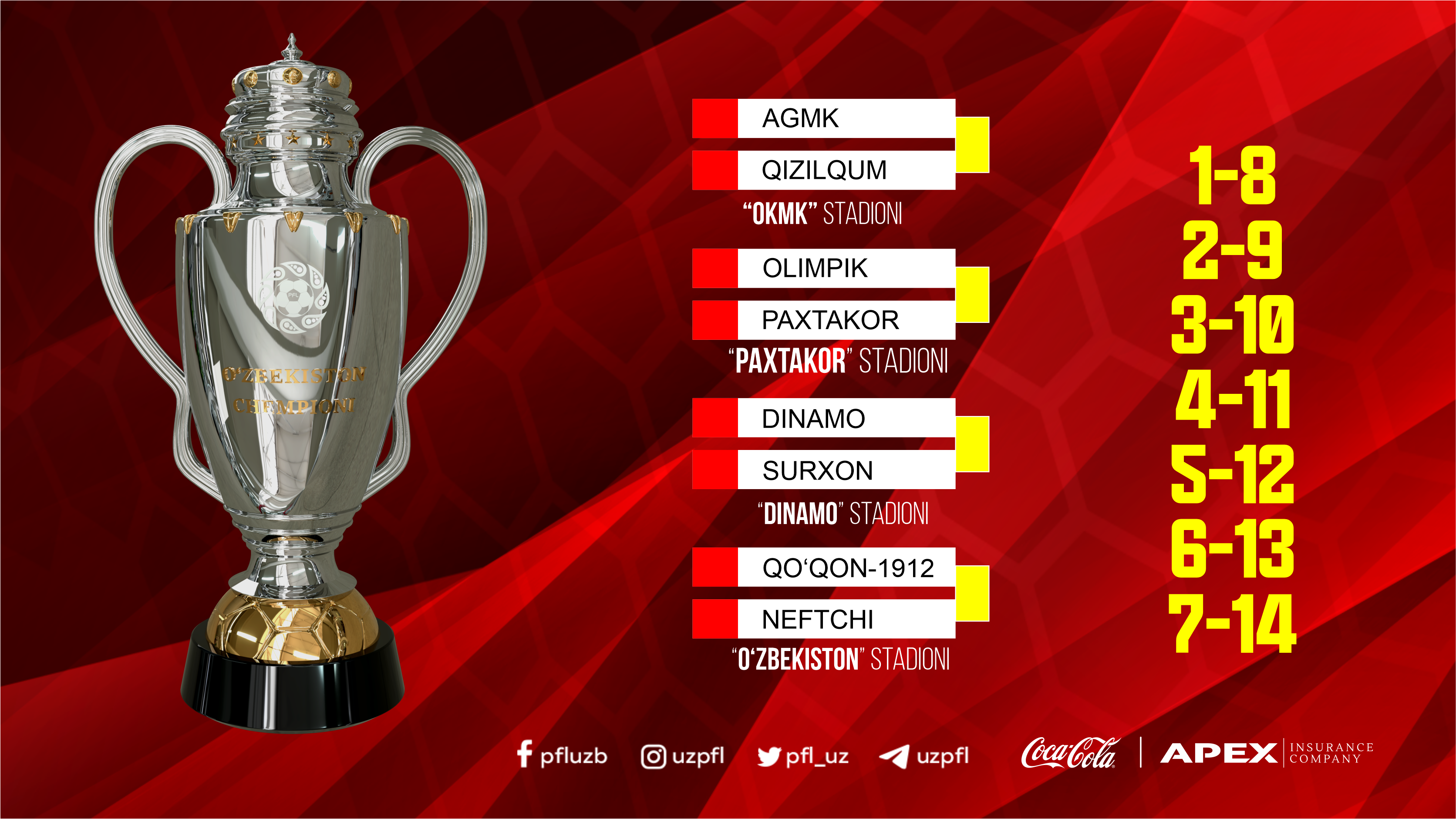 Demak, qur’a avvalida quyidagi 4 ta juftlik alohida ajratib olinadi: “Paxtakor” va “Olimpik”, “Dinamo” va “Surxon”, “Neftchi” va “Qo‘qon-1912”, “Qizilqum” va AGMK.