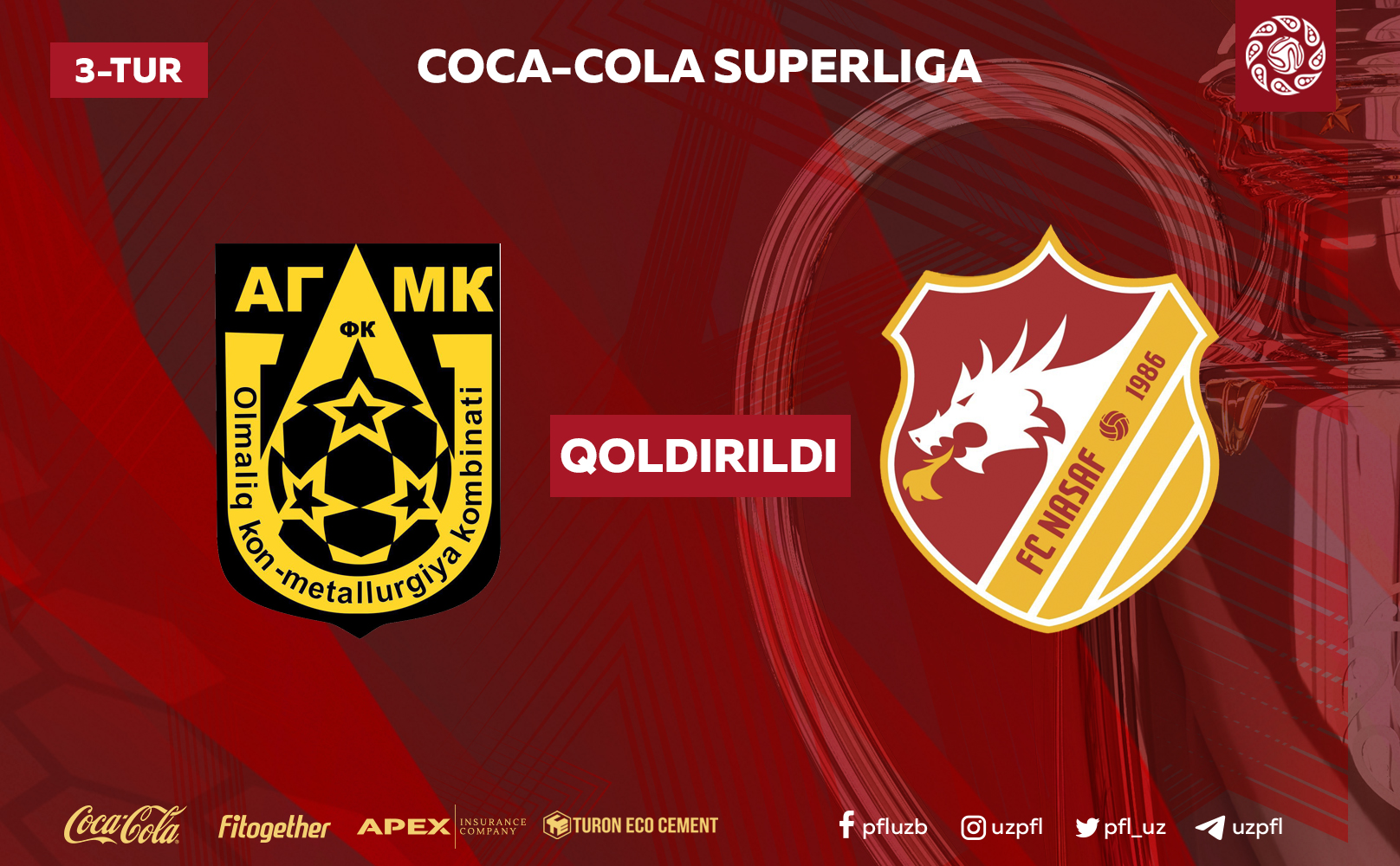 Coca-Cola Superliganing 3-turidan o‘rin olgan AGMK — “Nasaf” o‘yini Toshkent viloyati ichki ishlar bosh boshqarmasi so‘roviga ko‘ra qoldirildi.