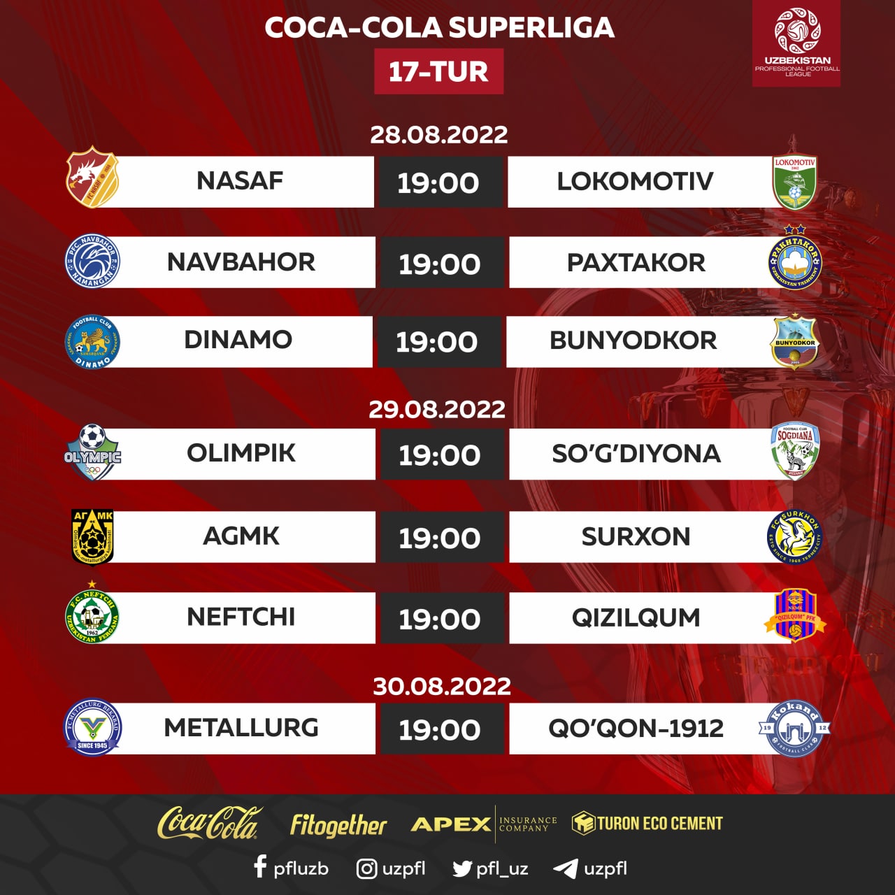 28 – 30-avgust kunlari Coca-Cola Superligada 17-tur bahslari bo‘lib o‘tadi.
