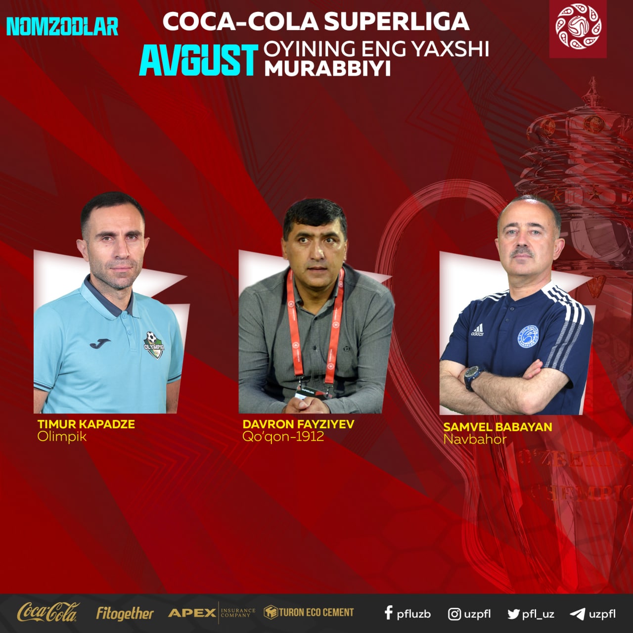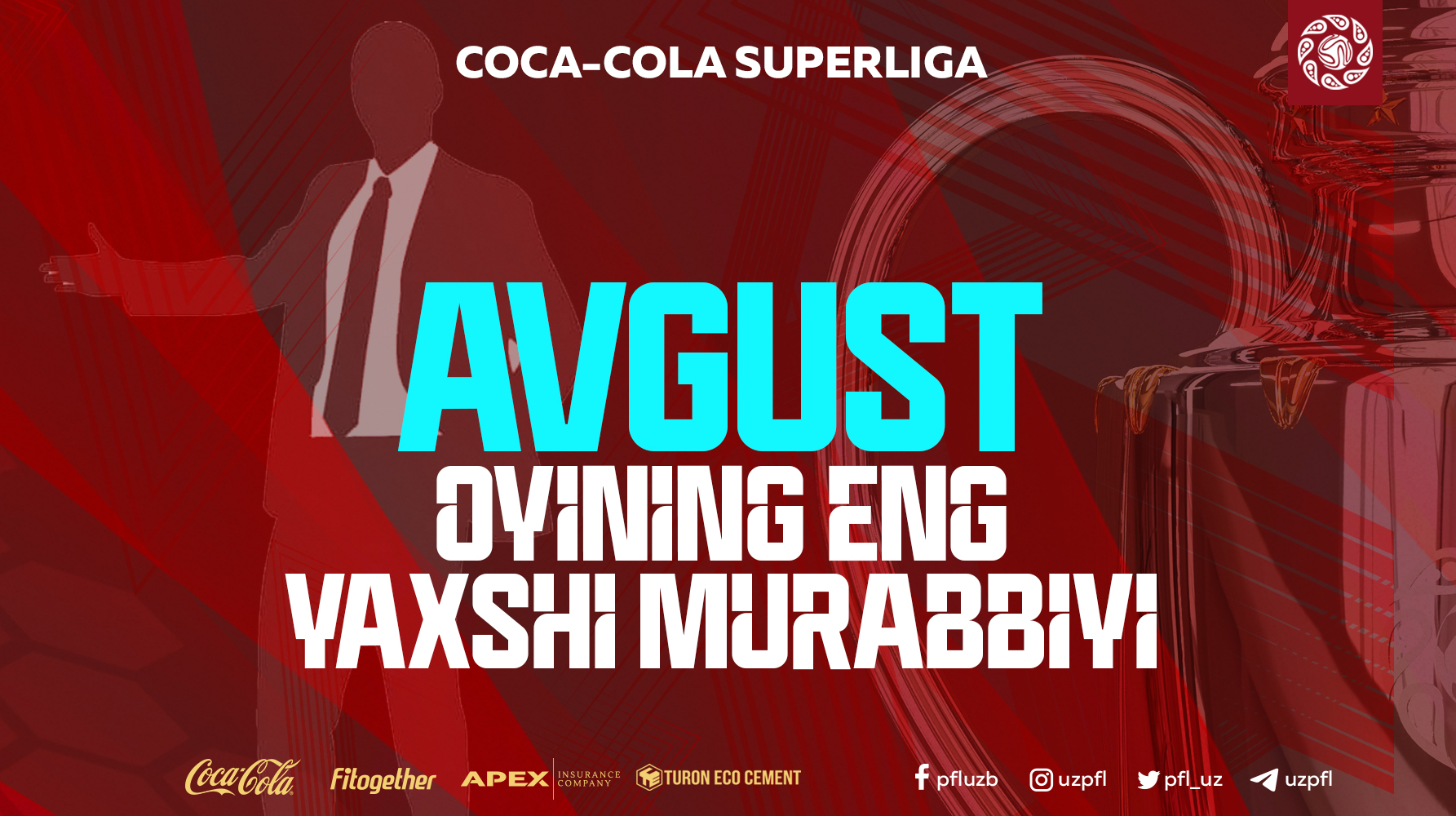 O‘zbekiston Professional futbol ligasi odatga ko‘ra, har oy Coca Cola Superligasining eng yaxshi murabbiyi va futbolchisi, shuningdek, eng chiroyli golni aniqlab keladi. Avgust oyida Superligada 4ta tur bahslari bo‘lib o‘tadi. Mazkur bellashuvlarda davomida ko‘plab murabbiylar o‘zlarini ko‘rsatishga erishdilar.