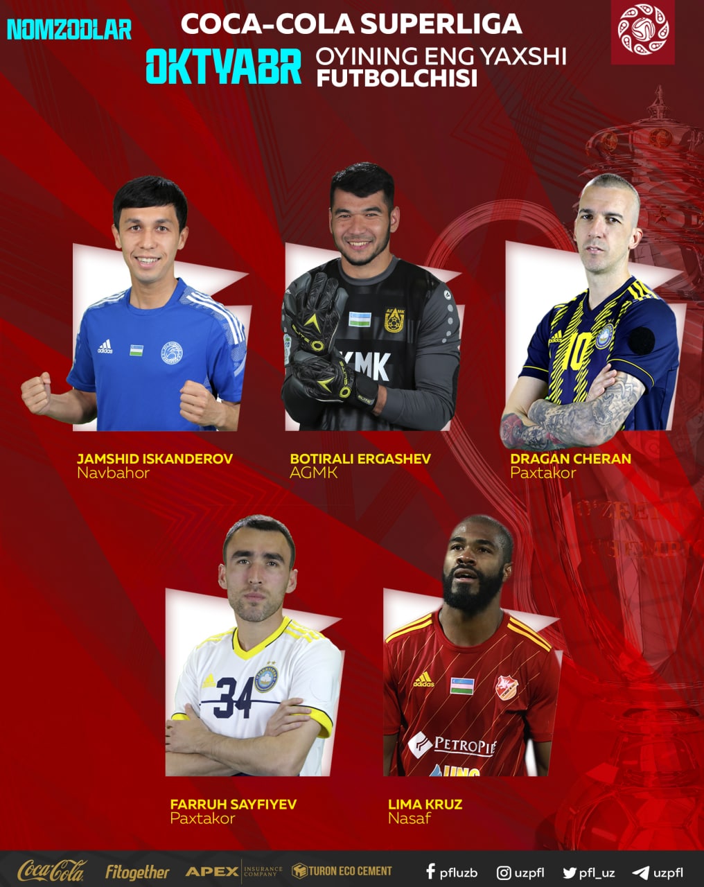 Bilasiz, O‘zbekiston Professional futbol ligasi odatga ko‘ra, har oy Coca-Cola Superliganing eng yaxshi murabbiyi va futbolchisi, shuningdek, eng chiroyli golni aniqlab keladi. Oktyabr oyida Superligada 4 ta tur bahslari bo‘lib o‘tdi. Mazkur bellashuvlar davomida ko‘plab futbolchilar o‘zlarini ko‘rsatishga erishdilar.
