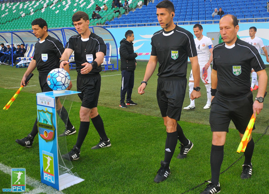 Suratda: Timur To`xtasinov «Neftchi» - «Bunedkor» uchrashuvini boshqarib boradi.