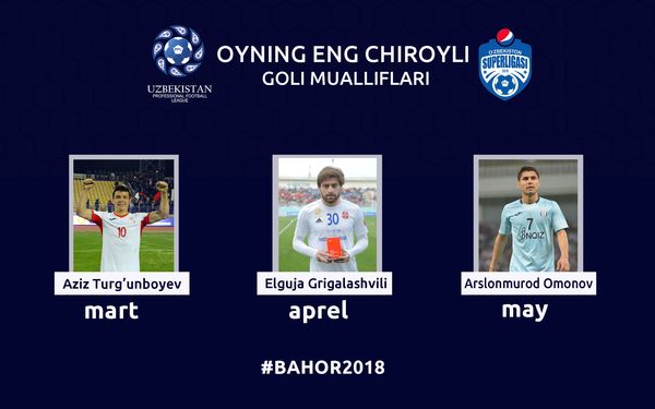 O`tgan uch oy davomida uch futbolchi eng chiroyli golga ikki martadan da`vogar bo`ldi. Qizig`i, ularning hammasi legionerlar: Arslonmurod Omonov, Elguja Grigalashvili, Filip Raevats. “Buxoro” a`zosi aprel oyi uchun raqobatda 7-o`rin bilan cheklangandi. Aprelning eng chiroyli goli muallifi Elguja esa mart oyida 8-pog`onadan joy olgan. Mayda uchinchi bo`lgan Raevats esa martda 6-o`rindan joy olgan.
