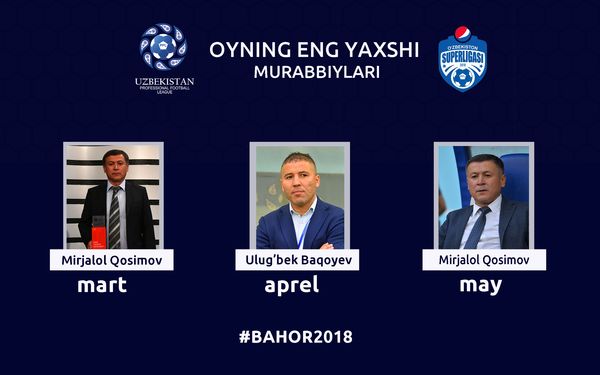 Ortda qolgan 3 oy sarhisob qilinganida, oyning eng yaxshi murabbiylari ichida “Bunyodkor” ustozi Mirjalol Qosimov boshqalardan ilgarilab ketganiga guvoh bo`lamiz. Tajribali mutaxassis 3 oyda 2 marta oy laureati bo`lishga erishdi. Qosimov mart va may oylarida tengsiz deb e`tirof etildi. Natijada uning hisobida ayni paytga kelib, jami 6 ochko mavjud bo`lib turibdi.