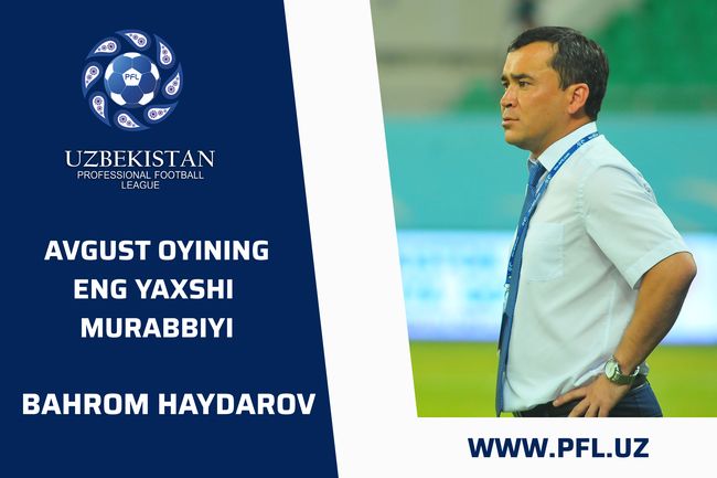 Oyning eng yaxshilarini aniqlash uchun o`tkazilgan so`rovnomada “Neftchi” jamoasi bosh murabbiyi Bahrom Xaydarov g`oliblikni qo`lga kiritdi. Mavsumni u qadar muvaffaqiyatli boshlay olmagan Bahrom Xaydarov ustozligidagi farg`onaliklar avgust oyini juda ko`tarinki ruhda o`tkazishdi va yakunda 2 g`alaba va 1 durang qayd etishdi. Jamoa avgustda umuman mag`lub bo`lmadi. Natijada so`rovnomada eng ko`p ovoz olgan murabbiy yakunda 43 ochko jamg`ardi.